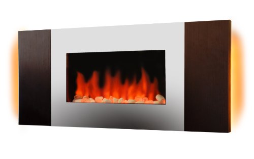 The Estate Design Springfield wall mount electric heater brings a unique style element and functionality to any room in your home. The mirrored fire display border is accented by a rich merlot finish wood veneer to provide a warm and stylish frame of the translucent rock bed. Coupled with the ambience provided by the dancing light of the glowing embers is the functionality that this is also a heater (up to 1350W). If your are looking for even more of a mood in the room, the Shelby also features adjustable multi-colored LED Back lighting. The flame, heater, and back lighting are all controlled through the remote control which is included as well.